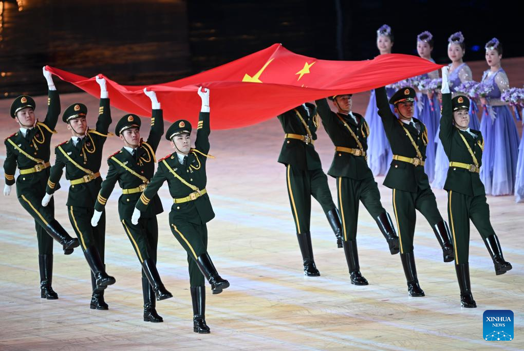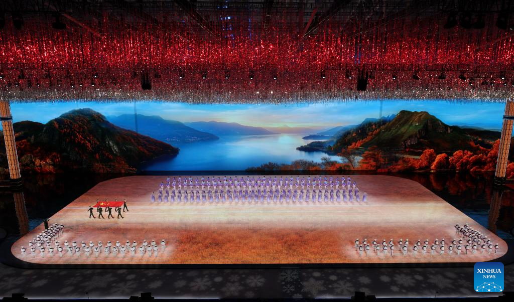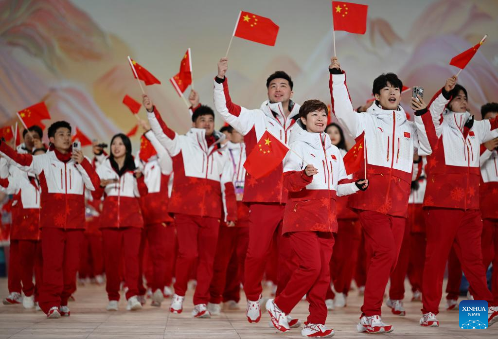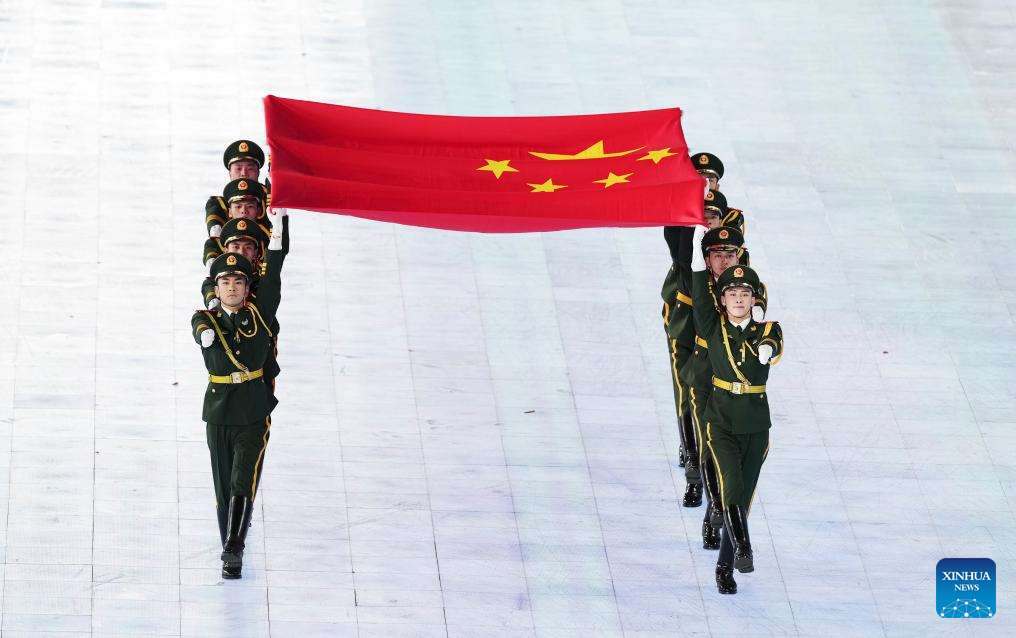 ووسط هتافات صاخبة من الجمهور، حمل نجم التزلج السريع نينغ تشونغ يان ولاعبة التزلج ليو منغ تينغ التي صنعت التاريخ بفوزها بالميدالية الذهبية في مسابقة "بيغ إير" للسيدات في كأس العالم للتزلج الحر في يناير، العلم الوطني الصيني خلال موكب الرياضيين.