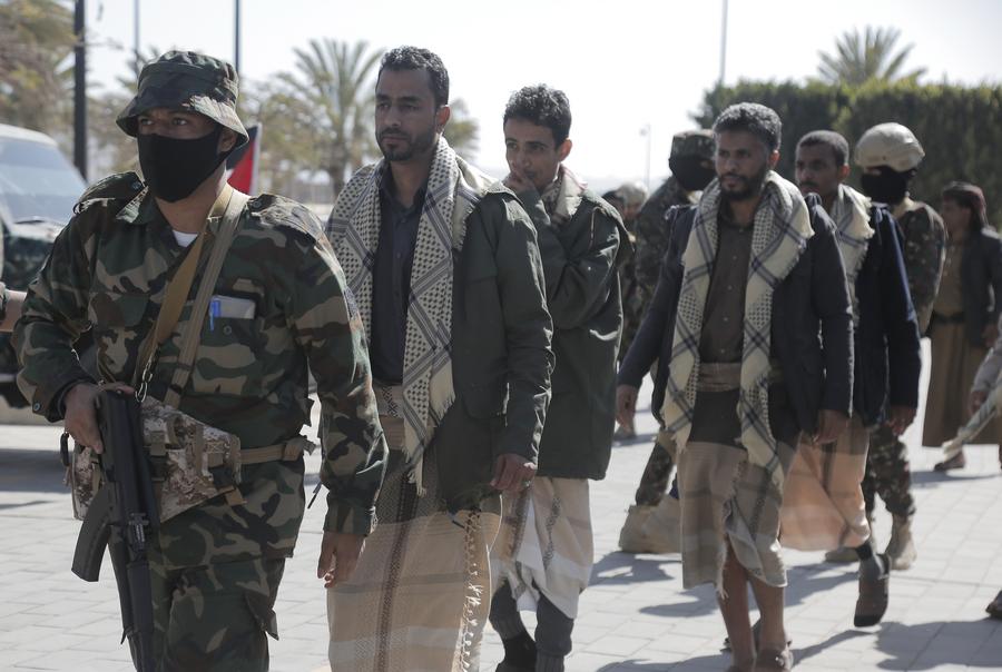 أحد عناصر قوات الأمن التابعة لجماعة الحوثي يقود سجناء حرب إلى مقر انعقاد مؤتمر صحفي أقيم بمناسبة إطلاق سراحهم في صنعاء باليمن في 25 يناير 2025. (شينخوا)