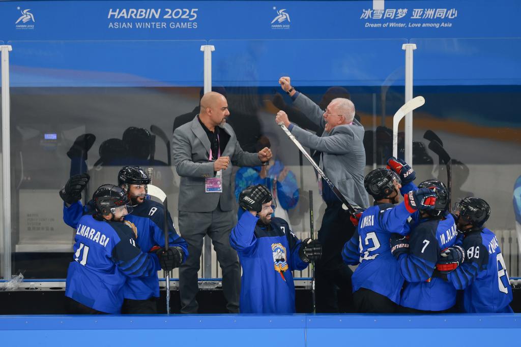 في الصورة الملتقطة يوم 10 فبراير 2025، فريق هوكي الجليد الكويتي يحتفل بإحرازه هدفا في منافسة تصفيات هوكي الجليد للرجال في دورة الألعاب الآسيوية الشتوية التاسعة في هاربين بشمال شرقي الصين. (شينخوا)