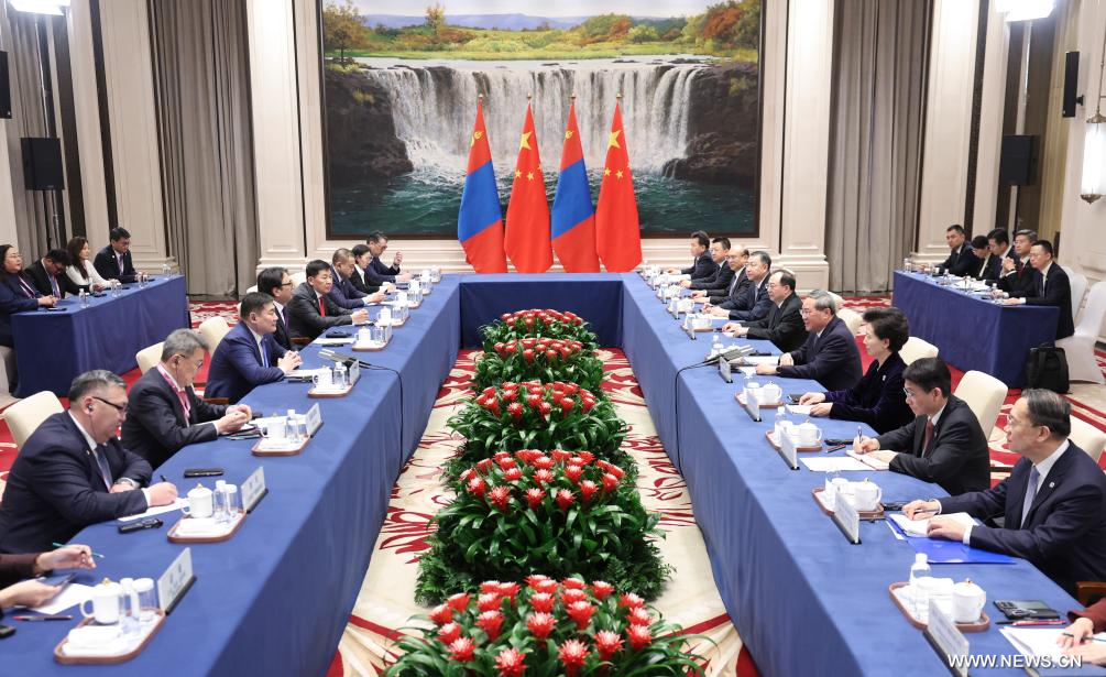 وأضاف أن الصين تقف على أهبة الاستعداد لتعزيز التضافر بين استراتيجيات التنمية في البلدين وتعزيز تنسيق السياسات مع منغوليا، والحفاظ على الزخم الإيجابي للتعاون الثنائي، ودفع التعاون في المجالات التقليدية مثل التعدين والطاقة والارتباطية والبنية التحتية، فضلا عن زيادة التعاون في المجالات الناشئة مثل الذكاء الاصطناعي والتنمية الخضراء.