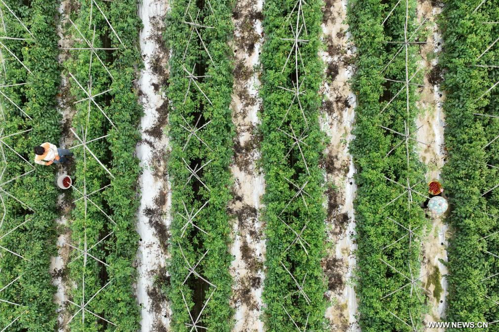 هايكو 21 فبراير 2025 (شينخوا) في الصورة الملتقطة يوم 19 فبراير 2025، مشهد حصاد الطماطم الكرزية في قرية تانلي بمحافظة دينغآن في مقاطعة هاينان بجنوبي الصين.