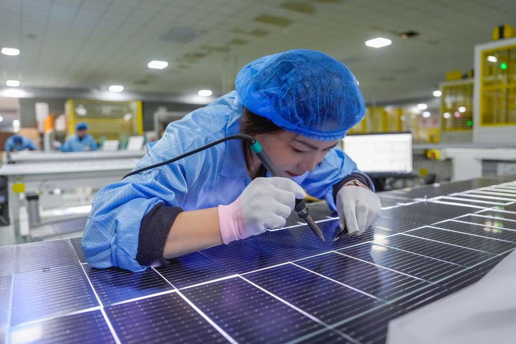 تونغشين 22 فبراير 2025 (شينخوا) في الصورة الملتقطة يوم 20 فبراير 2025، عاملة تعمل على لوحة كهروضوئية في مجمع صناعي في محافظة تونغشين بمدينة ووتشونغ في منطقة نينغشيا ذاتية الحكم لقومية هوي بشمال غربي الصين.