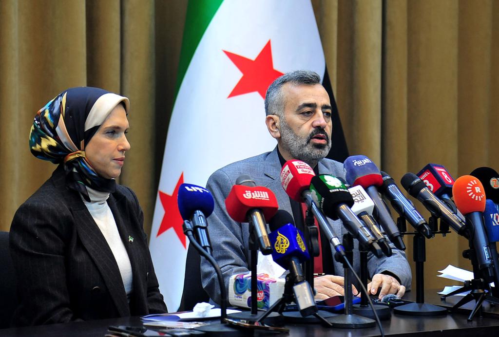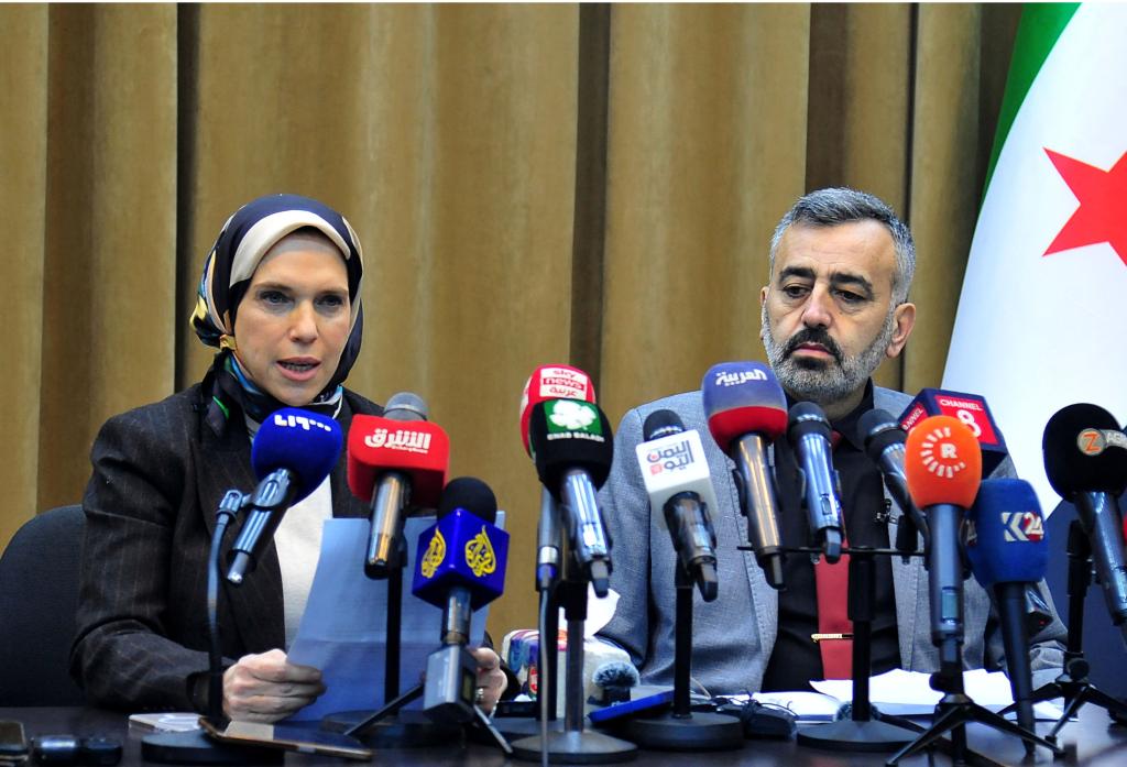 دمشق 23 فبراير 2025 (شينخوا) في الصورة الملتقطة يوم 23 فبراير 2025، المتحدث باسم اللجنة التحضيرية لمؤتمر الحوار الوطني السوري، حسن الدغيم، وعضو اللجنة هدى الأتاسي، يحضران مؤتمرا صحفيا في العاصمة السورية دمشق، حيث قال الدغيم، يوم السبت، إن سوريا ستستضيف مؤتمر الحوار الوطني "في الأيام المقبلة" لدفع الانتقال السياسي للبلاد والتصدي للتحديات السياسية والاقتصادية الملحة.