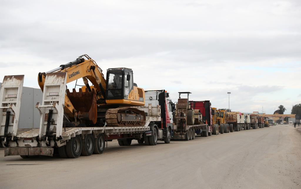 معبر رفح 25 فبراير 2025 (شينخوا) في الصورة الملتقطة يوم 24 فبراير 2025، معدات هندسية تنتظر الدخول إلى غزة من الجانب المصري لمعبر رفح الحدودي.