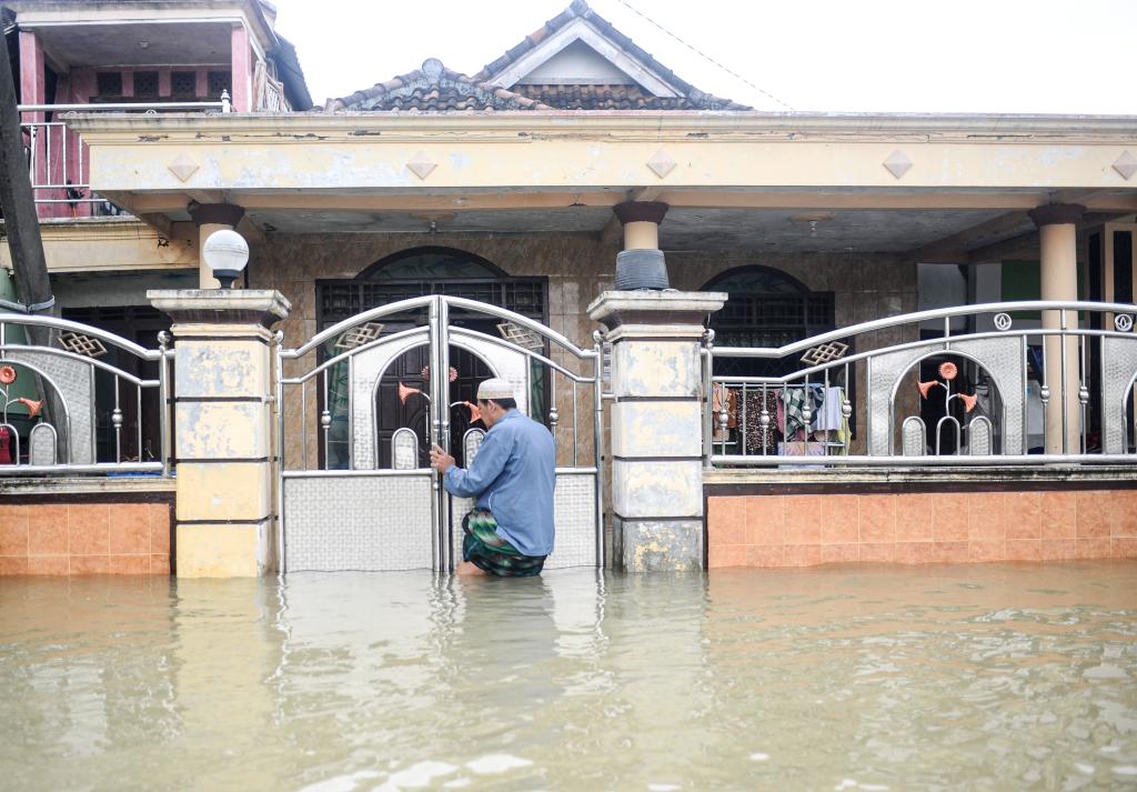 غرسيك 3 مارس 2025 (شينخوا) في الصورة الملتقطة يوم 2 مارس 2025، شخص يسير وسط مياه الفيضانات عقب هطول أمطار غزيرة على قرية في منطقة غرسيك بمقاطعة جاوة الشرقية في إندونيسيا.