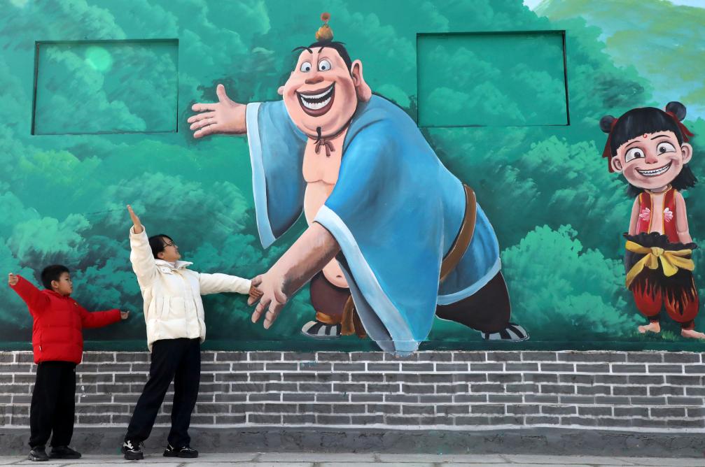 بكين 3 مارس 2025 (شينخوا) في الصورة الملتقطة يوم أول مارس 2025، سائحون يقفون لالتقاط الصور مع لوحة جدارية لفيلم الرسوم المتحركة الشهير "نه تشا 2" في قرية دونغفنغ بمدينة بينتشو في مقاطعة شاندونغ شرقي الصين.