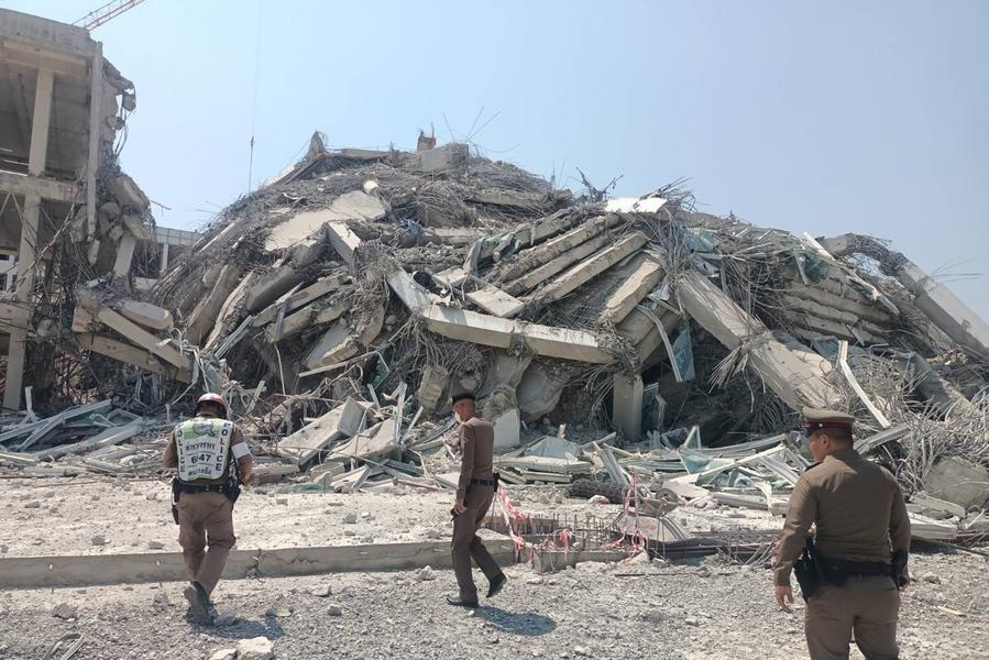 تظهر هذه الصورة الملتقطة في 28 مارس 2025 مبنى منهارا في بانكوك بتايلاند. وضرب زلزال بقوة 7.9 درجة على مقياس ريختر ميانمار عند الساعة 2:20 بعد ظهر يوم الجمعة (بتوقيت بكين)، وفقا لما ذكره مركز شبكات الزلازل الصيني.