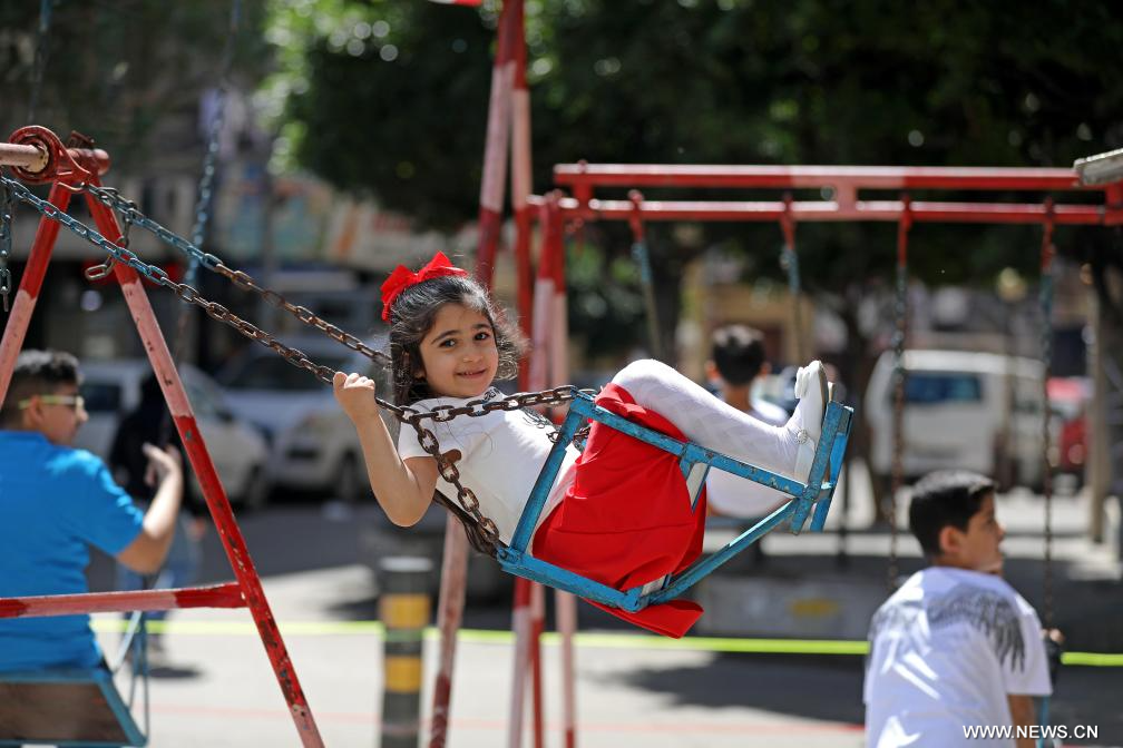 بيروت 31 مارس 2025 (شينخوا) في الصورة الملتقطة يوم 30 مارس 2025، طفلة تلعب على الأرجوحة وتستمتع بالأجواء الاحتفالية في أول أيام عيد الفطر في العاصمة اللبنانية بيروت.