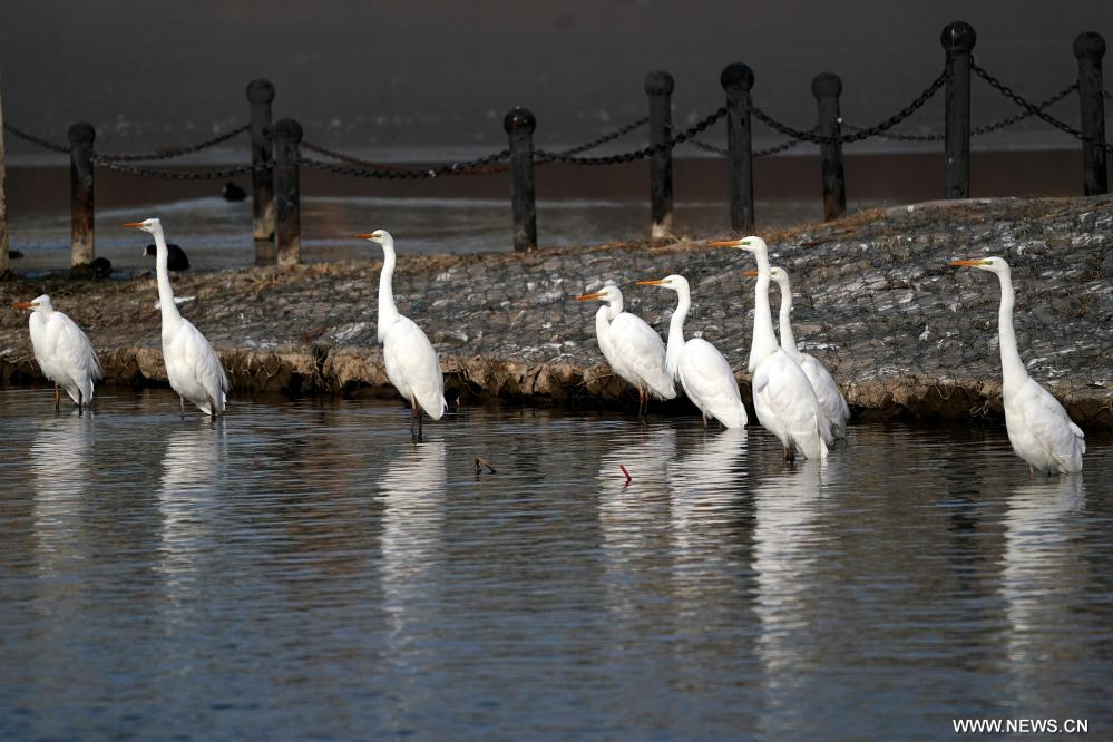 تاييوان 2 أبريل 2025 (شينخوا) في الصورة الملتقطة يوم أول يناير 2025، طيور بلشون أبيض تستريح على نهر فنخه في مدينة تاييوان، حاضرة مقاطعة شانشي بشمالي الصين.