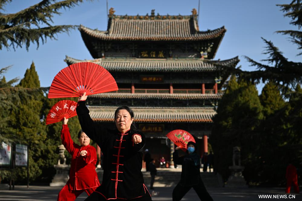تاييوان 2 أبريل 2025 (شينخوا) في الصورة الملتقطة يوم أول مارس 2023، أناس يمارسون رياضة تاي تشي بالمراوح في حديقة ينغتسه بحي ينغتسه في مدينة تاييوان، حاضرة مقاطعة شانشي بشمالي الصين.