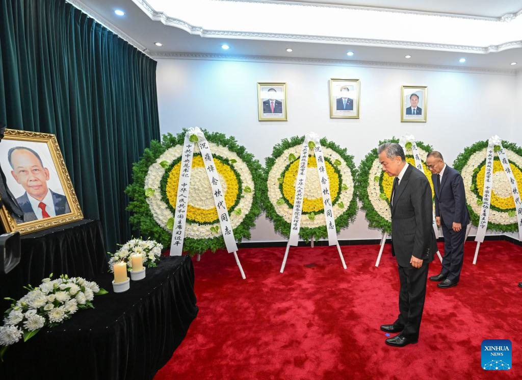 بكين 3 أبريل 2025 (شينخوا) توجه وانغ يي، عضو المكتب السياسي للجنة المركزية للحزب الشيوعي الصيني، إلى سفارة لاوس في الصين اليوم (الخميس)، لتقديم العزاء في وفاة خامتاي سيفاندون، رئيس لاوس السابق والرئيس السابق للحزب الثوري الشعبي اللاوسي.