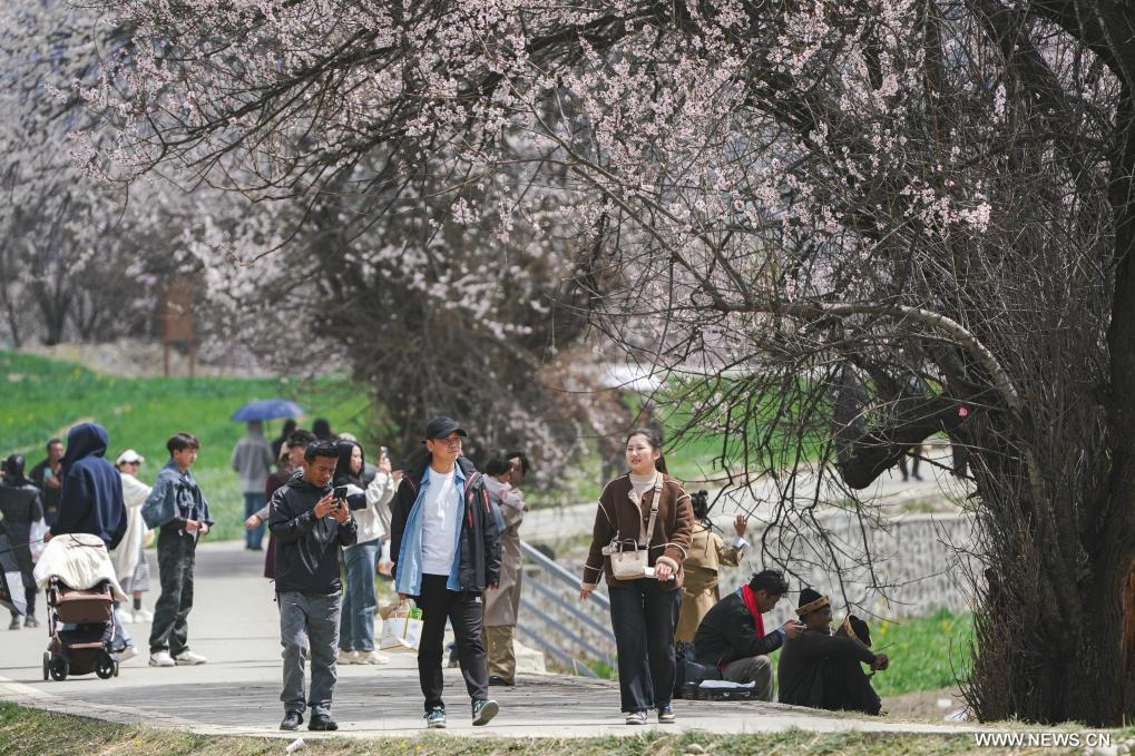 نينغتشي 4 أبريل 2025 (شينخوا) في الصورة الملتقطة يوم 3 أبريل 2025، سياح يتمتعون بتفتح زهور الخوخ في نينغتشي في منطقة شيتسانغ ذاتية الحكم بجنوب غربي الصين.