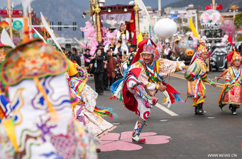 نينغتشي 4 أبريل 2025 (شينخوا) في الصورة الملتقطة يوم 3 أبريل 2025، فنانون يقدمون عرضا خلال مسيرة أثناء مهرجان زهور الخوخ للسياحة والثقافة في نينغتشي في منطقة شيتسانغ ذاتية الحكم بجنوب غربي الصين.