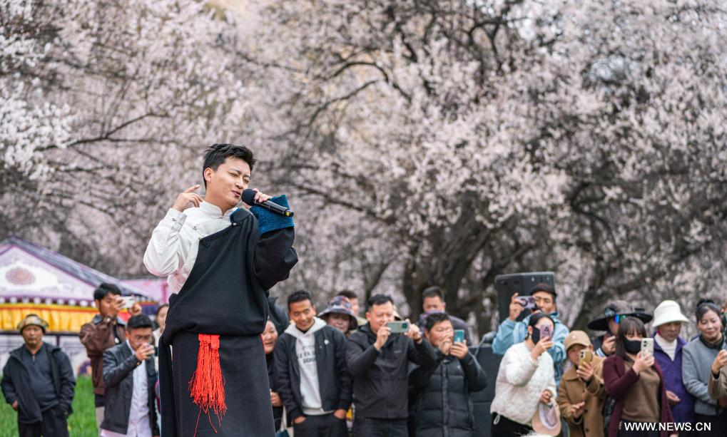 نينغتشي 4 أبريل 2025 (شينخوا) في الصورة الملتقطة يوم 3 أبريل 2025، فنان يغني أثناء مهرجان زهور الخوخ للسياحة والثقافة في نينغتشي في منطقة شيتسانغ ذاتية الحكم بجنوب غربي الصين.