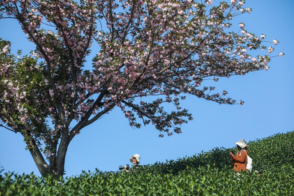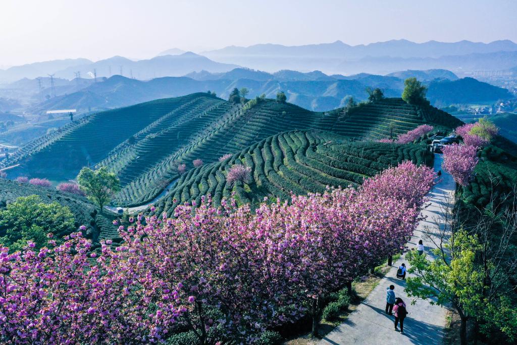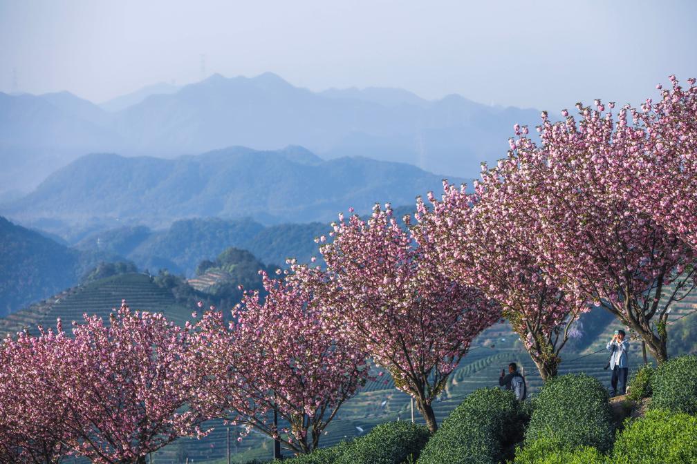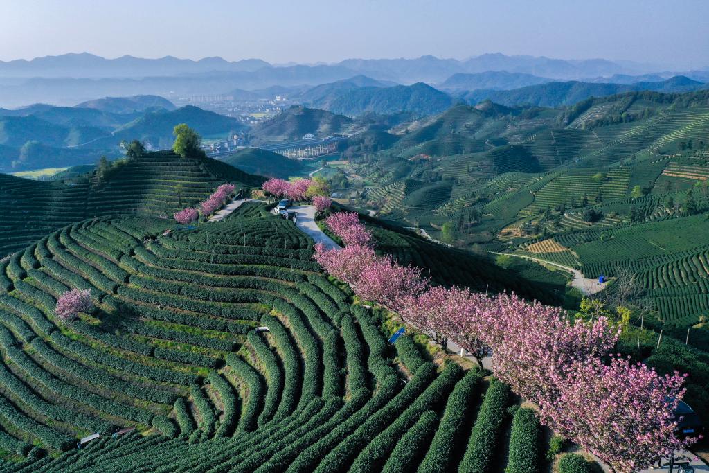 مناظر خلابة لأشجار الشاي والكرز في مقاطعة تشجيانغ بشرقي الصين
