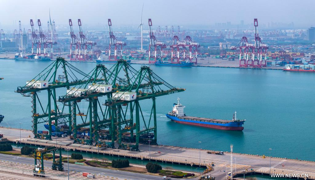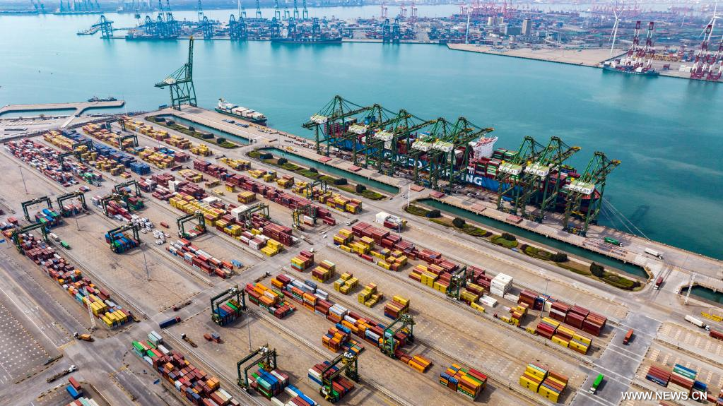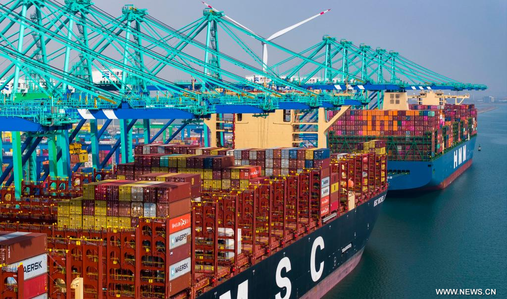 تيانجين 8 أبريل 2025 (شينخوا) في الصورة الملتقطة جوا بطائرة بدون طيار يوم 8 أبريل 2025، محطة حاويات بميناء تيانجين شمالي الصين.