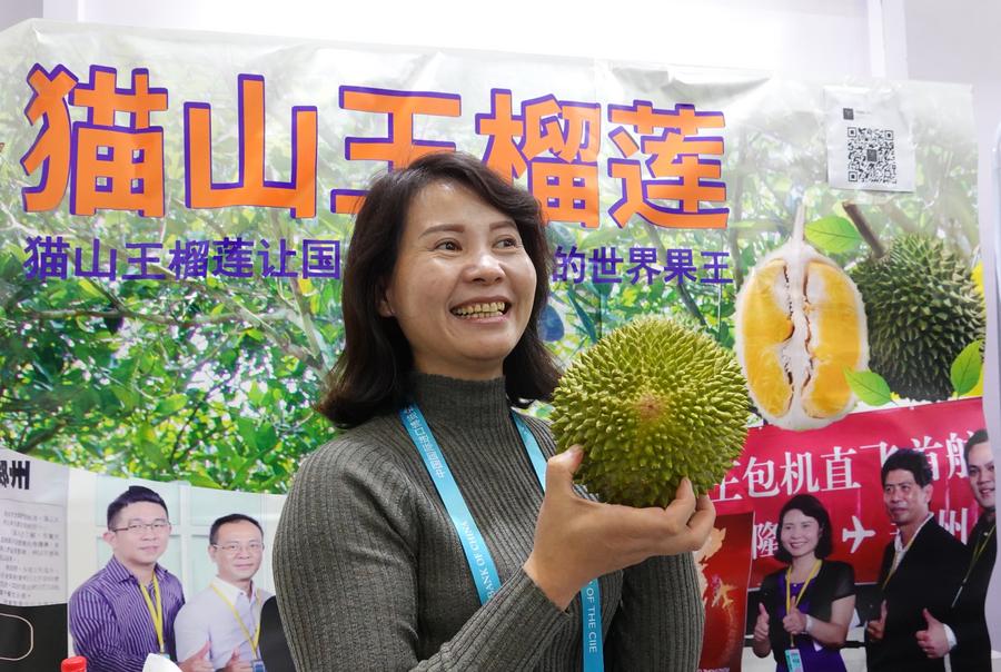 موظفة تقوم بعرض فاكهة الدوريان المستوردة من ماليزيا في معرض الصين الدولي الثاني للاستيراد في شانغهاي بشرق الصين في 9 نوفمبر 2019. (شينخوا)