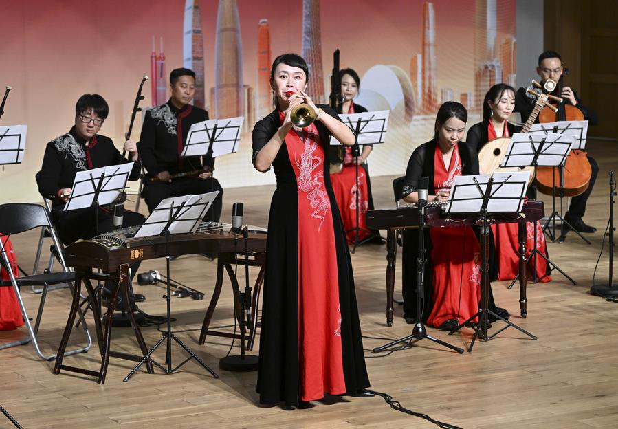 فنانون يقدمون عرضا في حفل إيقاعات كانتون لطريق الحرير في الحرم الجامعي لفرع جامعة شيامن بماليزيا في ولاية سيلانغور في ماليزيا في 24 نوفمبر 2023. (شينخوا)
