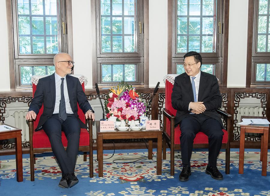 بكين 14 أبريل 2025 (شينخوا) التقى فو هوا، رئيس وكالة أنباء ((شينخوا))، جان-لوك بريسي، نائب المدير العام لـ ((فيجارو جروب))، في بكين اليوم (الاثنين).