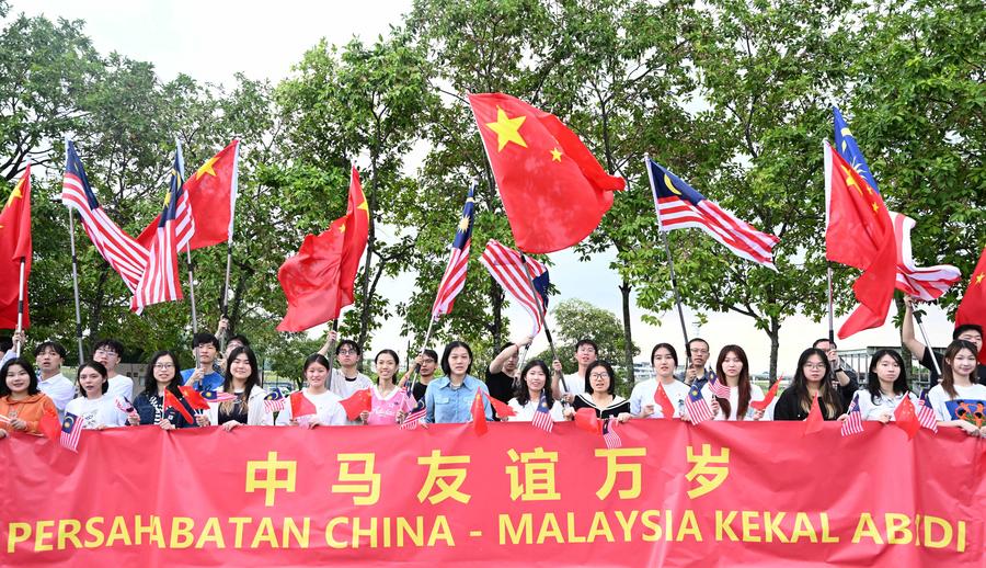 أناس يرحبون بالرئيس الصيني شي جين بينغ في كوالالمبور بماليزيا في 15 أبريل 2025. (شينخوا)