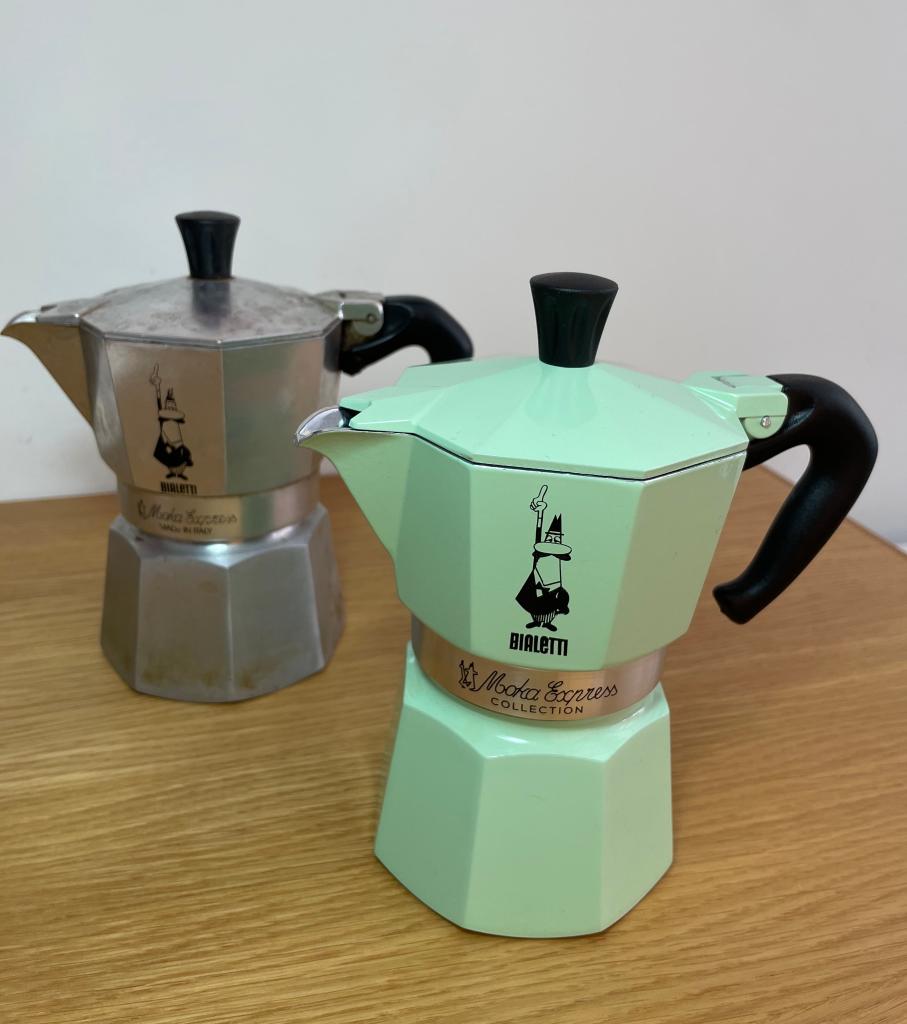 تُظهر الصورة الملتقطة في 25 أبريل 2021 اصدارا من بيالتي لصنع قهوة الموكا باللون الأخضر أمام نسخة معدنية تقليدية مضى على إنتاجها 20 سنة على الأقل، في روما، إيطاليا. (شينخوا)