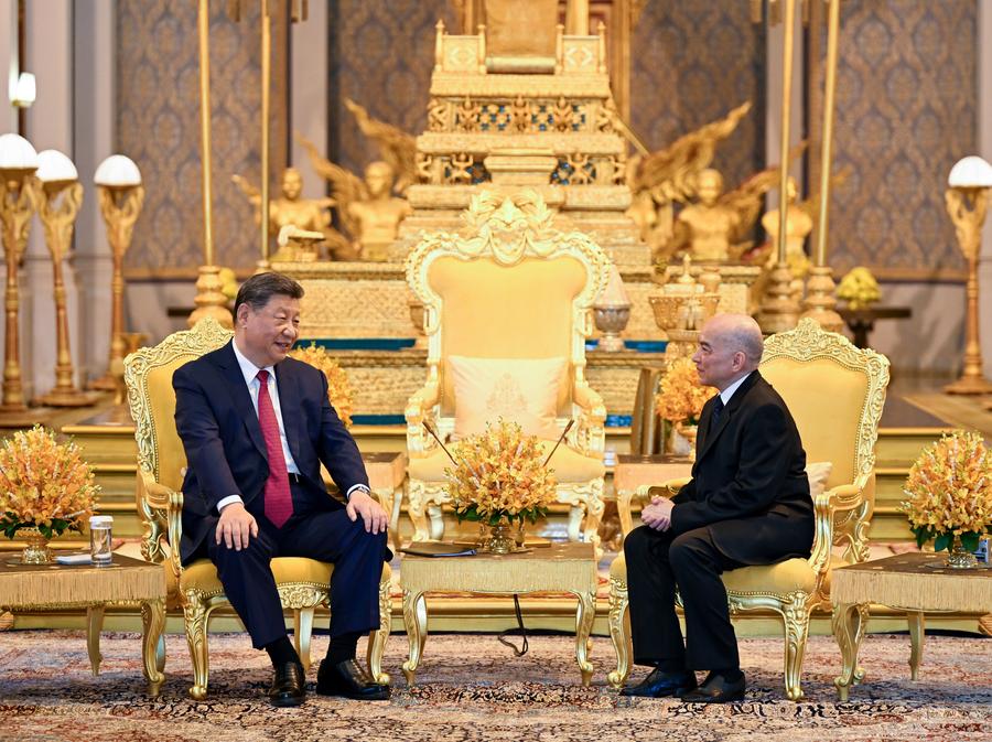 الرئيس الصيني شي جين بينغ يلتقي ملك كمبوديا نورودوم سيهاموني في القصر الملكي في بنوم بنه، كمبوديا، في 17 أبريل 2025. (شينخوا)