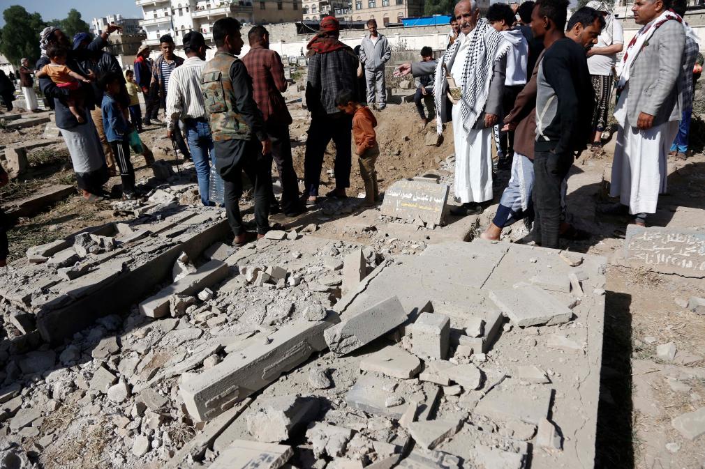 صنعاء 20 أبريل 2025 (شينخوا) في الصورة الملتقطة يوم 20 أبريل 2025، أشخاص يتجمعون في مقبرة عامة عقب غارات جوية أمريكية في العاصمة اليمنية صنعاء. قتل 3 أشخاص على الأقل وأصيب 4 آخرون ليلة السبت في غارات جوية أمريكية جديدة على العاصمة صنعاء وضواحيها وغيرها من المحافظات، حسبما ذكرت قناة ((المسيرة)) التي يديرها الحوثيون، نقلا عن السلطات الصحية.