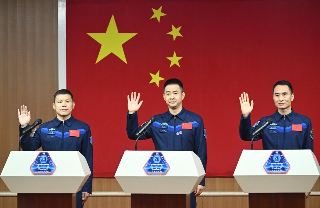 في الصورة الملتقطة يوم 23 أبريل 2025، رواد الفضاء الصينيون تشن دونغ (في الوسط)، و تشن تشونغ روي (إلى اليمين)، و وانغ جيه، أعضاء طاقم مهمة "شنتشو-20"، يلتقون بالصحافة في مؤتمر صحفي عقد في مركز جيوتشيوان لإطلاق الأقمار الصناعية في شمال غربي الصين.