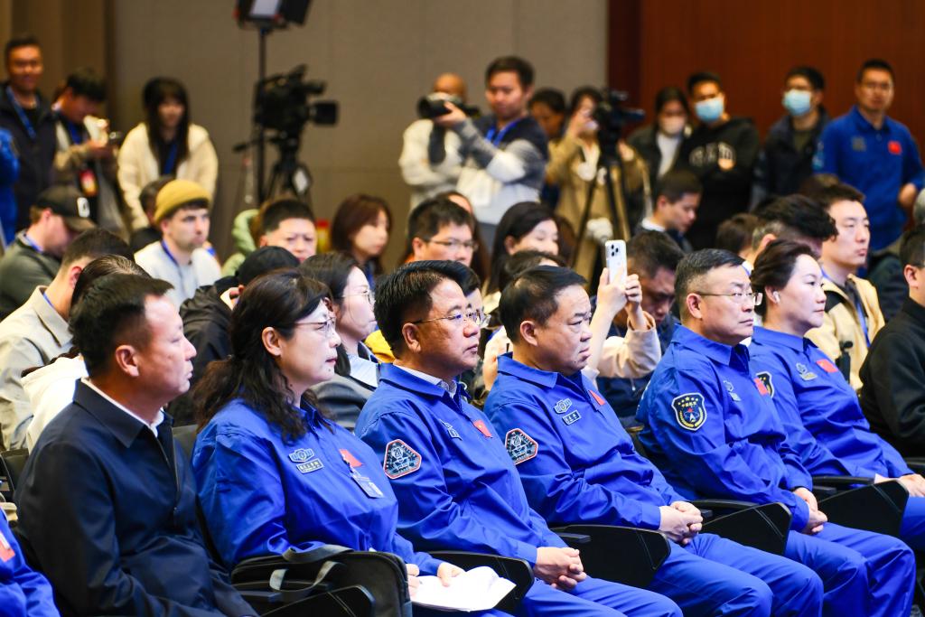 في الصورة الملتقطة يوم 23 أبريل 2025، جانب من المؤتمر الصحفي الذي عقد اليوم الأربعاء في مركز جيوتشيوان لإطلاق الأقمار الصناعية شمال غربي الصين، حيث أعلنت وكالة الفضاء المأهول الصينية خلاله أن الرواد الصينيين تشن دونغ و تشن تشونغ روي و وانغ جيه سينفذون مهمة رحلات الفضاء المأهولة "شنتشو-20".