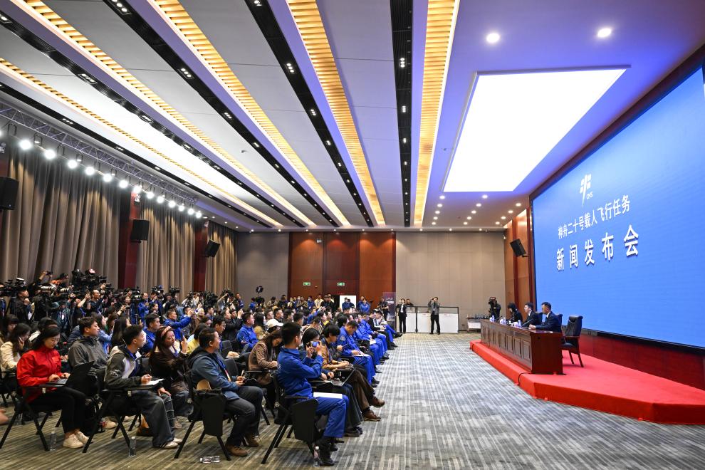 جيوتشيوان 23 أبريل 2025 (شينخوا) في الصورة الملتقطة يوم 23 أبريل 2025، جانب من المؤتمر الصحفي الذي عقد اليوم الأربعاء في مركز جيوتشيوان لإطلاق الأقمار الصناعية شمال غربي الصين، حيث أعلنت وكالة الفضاء المأهول الصينية خلاله أن الرواد الصينيين تشن دونغ و تشن تشونغ روي و وانغ جيه سينفذون مهمة رحلات الفضاء المأهولة "شنتشو-20".