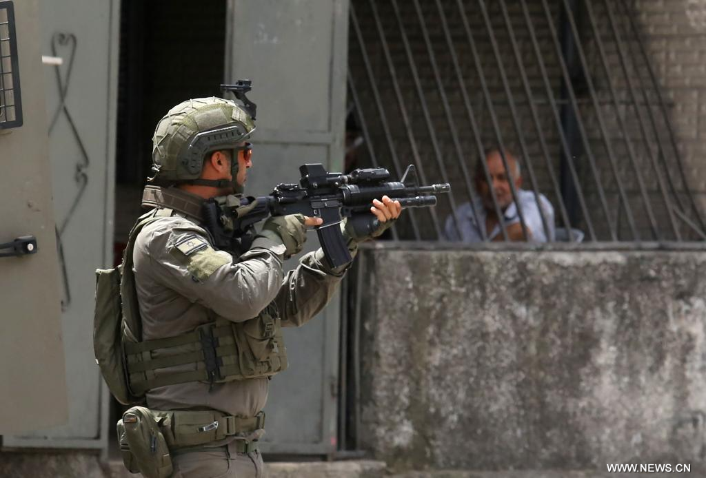 نابلس 25 أبريل 2025 (شينخوا) في الصورة الملتقطة يوم 24 أبريل 2025، جندي إسرائيلي خلال عملية عسكرية في مخيم بلاطة للاجئين الفلسطينيين شرق مدينة نابلس في شمالي الضفة الغربية.