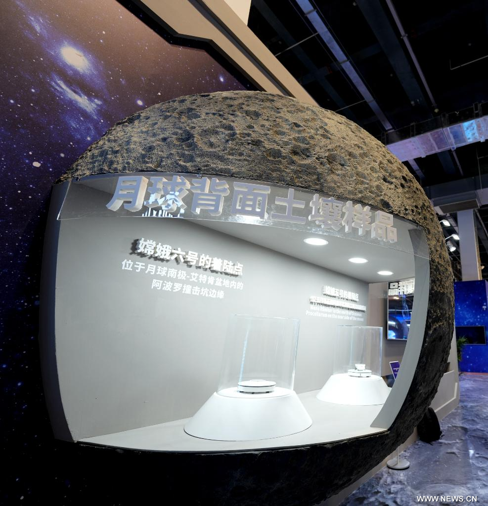 شانغهاي 25 أبريل 2025 (شينخوا) في الصورة الملتقطة يوم 23 أبريل 2025، عرض عينات من التربة القمرية التي جمعت من الجانب البعيد للقمر خلال معرض علمي بمناسبة يوم الفضاء العاشر للصين في مركز شانغهاي العالمي للمعارض والمؤتمرات في شانغهاي بشرقي الصين.