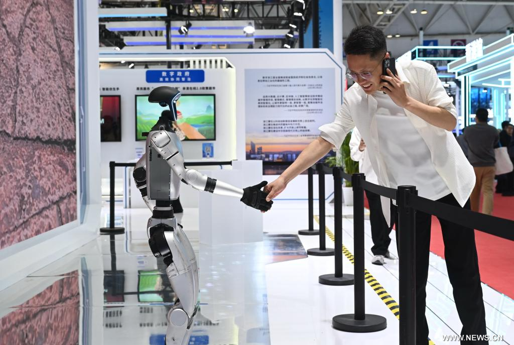 فوتشو 29 أبريل 2025 (شينخوا) في الصورة الملتقطة يوم 28 أبريل 2025، زائر يتفاعل مع روبوت بشري في منطقة التجربة لقمة الصين الرقمية الثامنة في مدينة فوتشو، حاضرة مقاطعة فوجيان بجنوب شرقي الصين.