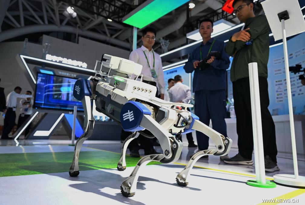 فوتشو 29 أبريل 2025 (شينخوا) في الصورة الملتقطة يوم 28 أبريل 2025، موظف يقوم بتشغيل كلب روبوت في منطقة التجربة لقمة الصين الرقمية الثامنة في مدينة فوتشو، حاضرة مقاطعة فوجيان بجنوب شرقي الصين.