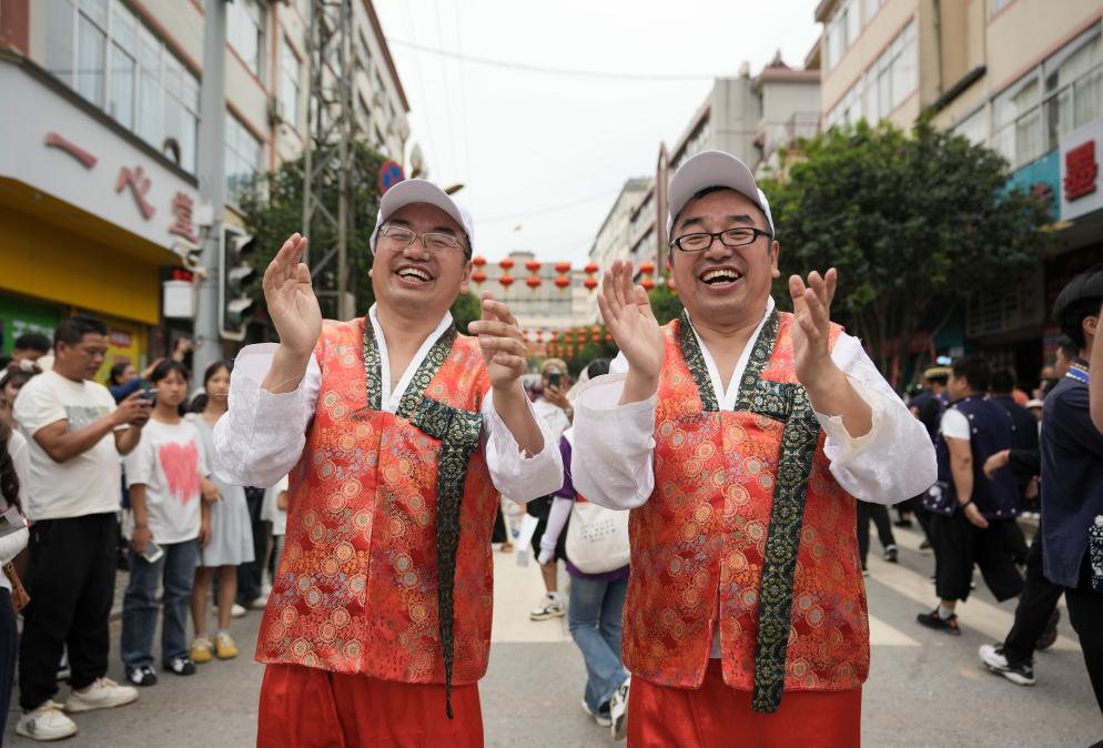 موجيانغ 2 مايو 2025 (شينخوا) في الصورة الملتقطة يوم 1 مايو 2025، زوج من التوائم خلال مهرجان موجيانغ الدولي التاسع عشر للتوائم في محافظة موجيانغ ذاتية الحكم لقومية هاني في مقاطعة يوننان بجنوب غربي الصين. وشارك أكثر من 1000 شخص من التوائم من جميع أنحاء العالم في مسيرة معنية خلال المهرجان.