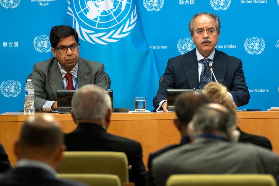 عاصم افتخار أحمد (اليمين في الخلف)، المندوب الدائم لباكستان لدى الأمم المتحدة، يتحدث في مؤتمر صحفي في مقر الأمم المتحدة في نيويورك في 2 مايو 2025. (شينخوا)