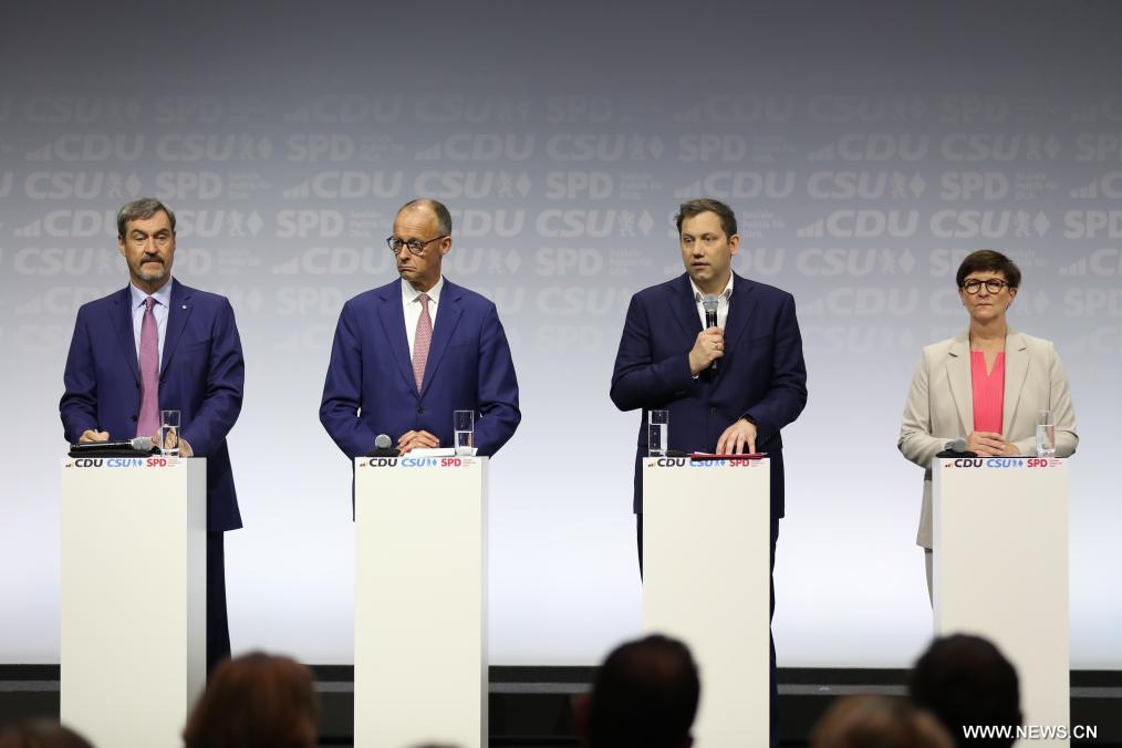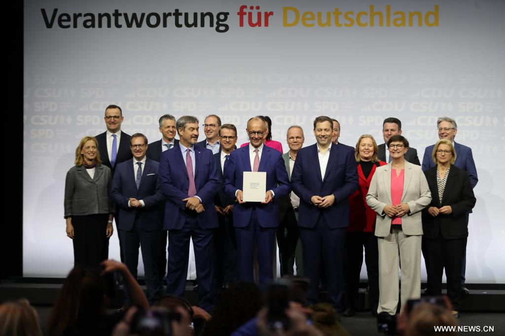 برلين 5 مايو 2025 (شينخوا) وقّع زعماء التحالف المسيحي المحافظ (الاتحاد الديمقراطي المسيحي/الاتحاد الاجتماعي المسيحي)، والحزب الديمقراطي الاجتماعي ذي التوجهات اليسارية الوسطية، اليوم (الاثنين) اتفاق ائتلاف في برلين، ما يمهد الطريق أمام تشكيل حكومة اتحادية جديدة.
