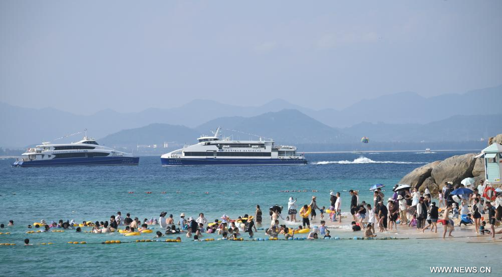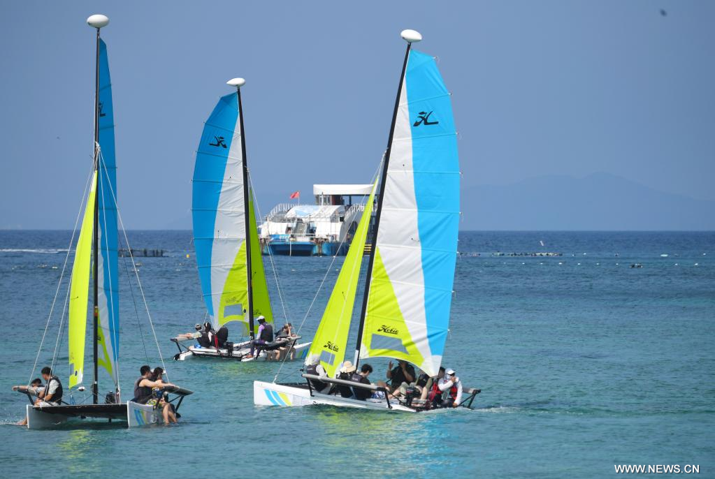 بكين 5 مايو 2025 (شينخوا) في الصورة الملتقطة يوم 3 مايو 2025، زوار يجربون أنشطة سياحية بحرية في مدينة سانيا بمقاطعة هاينان بجنوبي الصين. وخلال عطلة عيد العمال، استمتع الناس بأوقاتهم من خلال مجموعة متنوعة من الأنشطة الترفيهية المبهجة.