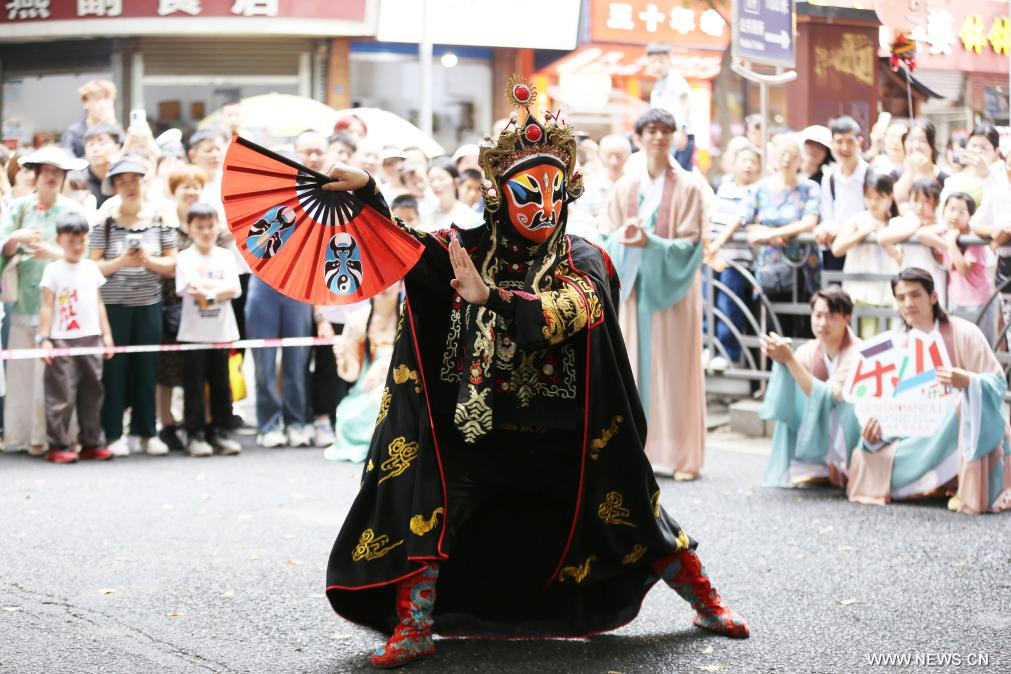 بكين 5 مايو 2025 (شينخوا) في الصورة الملتقطة يوم 3 مايو 2025، زوار يشاهدون عرض "تغيير الوجوه" الخاص بأوبرا سيتشوان في مدينة لهشان بمقاطعة سيتشوان في جنوب غربي الصين. وخلال عطلة عيد العمال، استمتع الناس بأوقاتهم من خلال مجموعة متنوعة من الأنشطة الترفيهية المبهجة.