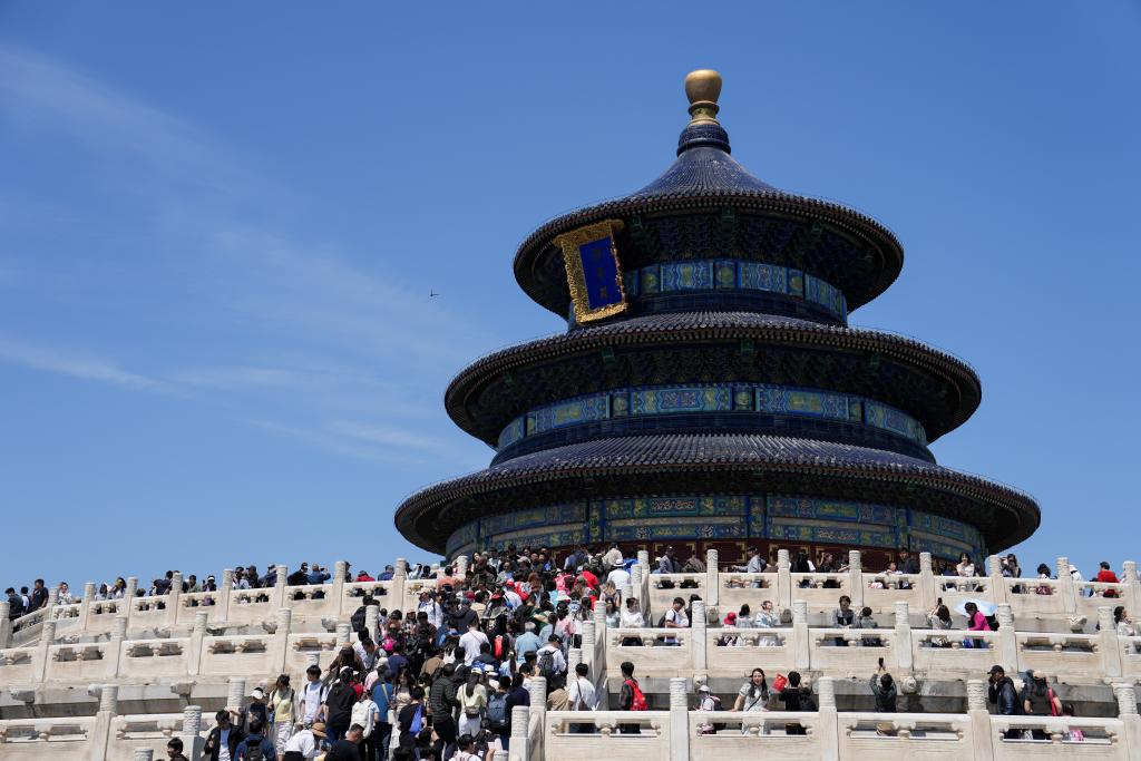 في الصورة الملتقطة يوم أول مايو 2025، زوار يزورون حديقة تيانتان (معبد السماء) في بكين. (شينخوا)