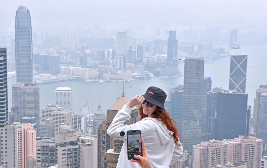 هونغ كونغ 6 مايو 2025 (شينخوا) في الصورة الملتقطة يوم 3 مايو 2025، سائحة تلتقط صورا في جناح الأسد في قمة فيكتوريا في منطقة هونغ كونغ الإدارية الخاصة بجنوبي الصين.