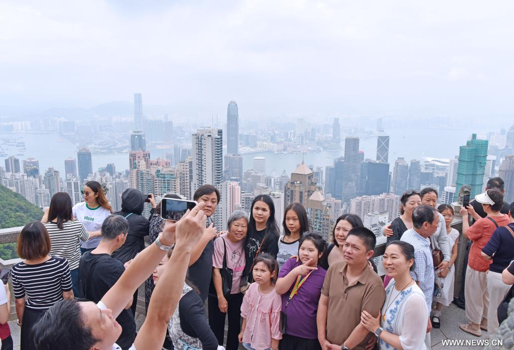 هونغ كونغ 7 مايو 2025 (شينخوا) في الصورة الملتقطة يوم 3 مايو 2025، سياح يلتقطون صورا في جناح الأسد في قمة فيكتوريا في منطقة هونغ كونغ الإدارية الخاصة بجنوبي الصين.