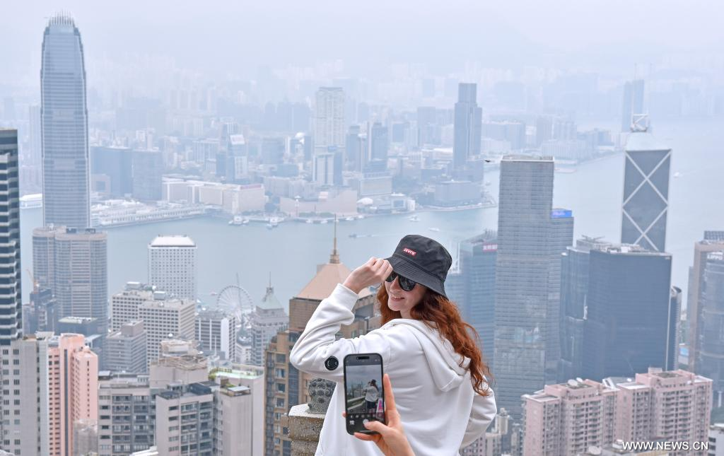 هونغ كونغ 7 مايو 2025 (شينخوا) في الصورة الملتقطة يوم 3 مايو 2025، سائحة تلتقط صورا في جناح الأسد في قمة فيكتوريا في منطقة هونغ كونغ الإدارية الخاصة بجنوبي الصين.
