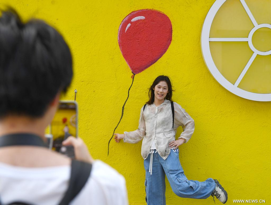 هونغ كونغ 7 مايو 2025 (شينخوا) في الصورة الملتقطة يوم 4 مايو 2025، سائحة تلتقط صورا في طريق سوق ستانلي في منطقة هونغ كونغ الإدارية الخاصة بجنوبي الصين.