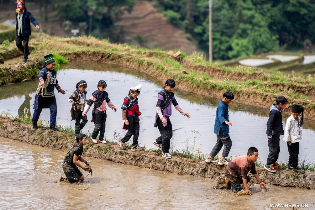 كونمينغ 7 مايو 2025 (شينخوا) في الصورة الملتقطة يوم 2 مايو 2025، أطفال يصطادون الأسماك خلال فعالية بمناسبة بدء زراعة الأرز في الحقول المدرجة في قرية جياين في ولاية هونغخه ذاتية الحكم لقوميتي هاني ويي بمقاطعة يوننان بجنوب غربي الصين.