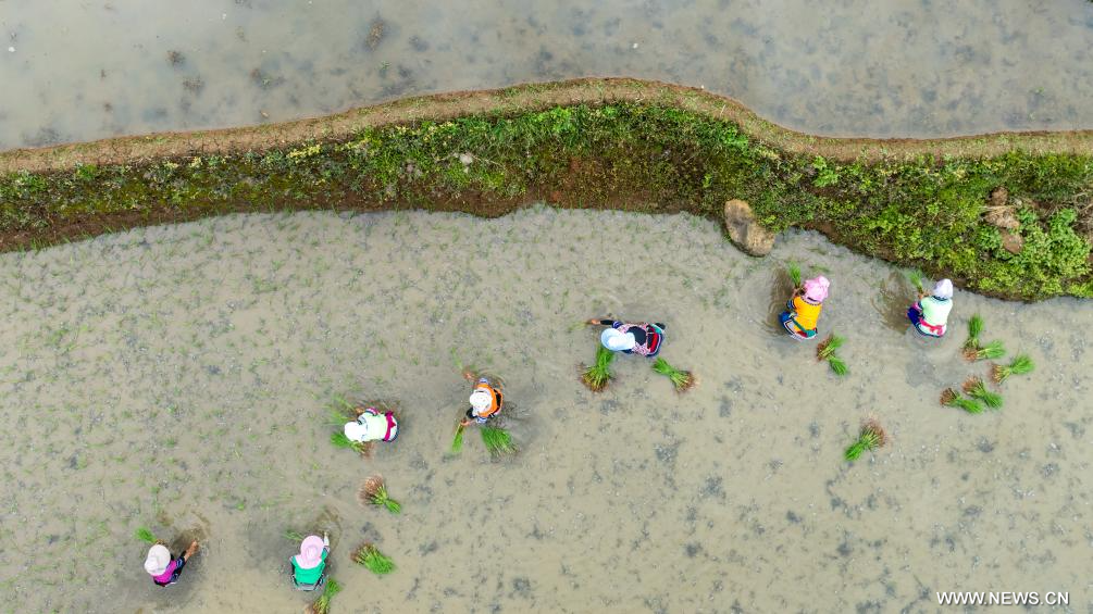 كونمينغ 7 مايو 2025 (شينخوا) في الصورة الملتقطة جوا يوم 2 مايو 2025، قرويون يزرعون شتلات الأرز في الحقول المدرجة في قرية جياين في ولاية هونغخه ذاتية الحكم لقوميتي هاني ويي بمقاطعة يوننان بجنوب غربي الصين.