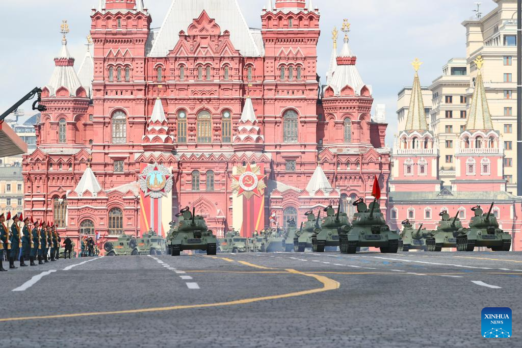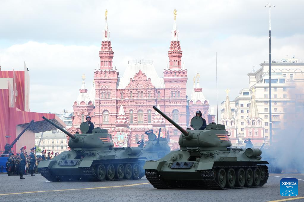 وسارت أفواج احتفالية من مختلف الدول في الساحة الحمراء، تلتها أرتال من المعدات العسكرية بقيادة دبابات تي-34 الأسطورية.
