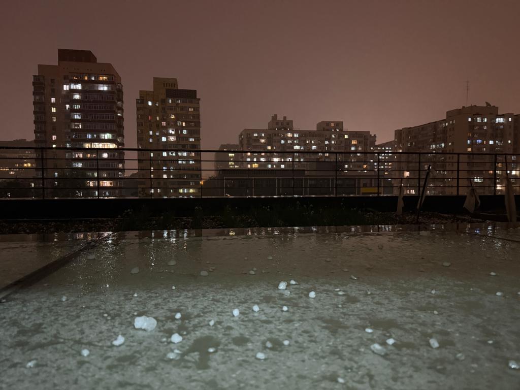بكين 14 مايو 2025 (شينخوا) في الصورة الملتقطة 13 مايو 2025، حبات برد في حي شيتشنغ في العاصمة الصينية بكين. وشهدت أجزاء من بكين رياحا قوية وعواصف رعدية يوم الثلاثاء الماضي.