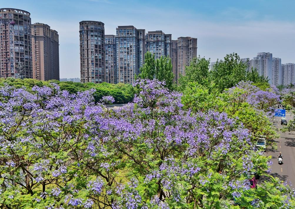تشنغدو 14 مايو 2025 (شينخوا) في الصورة الملتقطة جوا يوم 12 مايو 2025، أشجار جاكرندا في أوج ازهارها على طول طريق سانسه في حي جينجيانغ بمدينة تشنغدو في مقاطعة سيتشوان جنوب غربي الصين. ومع ارتفاع درجات الحرارة، تدخل أشجار الجاكرندا في المدينة فترة الإزهار الكامل.