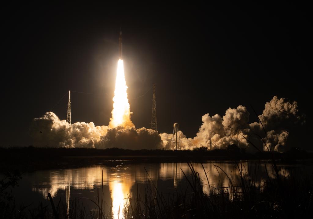 صاروخ نظام الاطلاق الفضائي التابع لوكالة ناسا يحمل المركبة أوريون الفضائية خلال إقلاعه في مهمة "أرتميس 1" التجريبية من مركز كينيدي للفضاء التابع لناسا في فلوريدا بالولايات المتحدة، يوم 16 نوفمبر 2022. (ناسا/شينخوا)